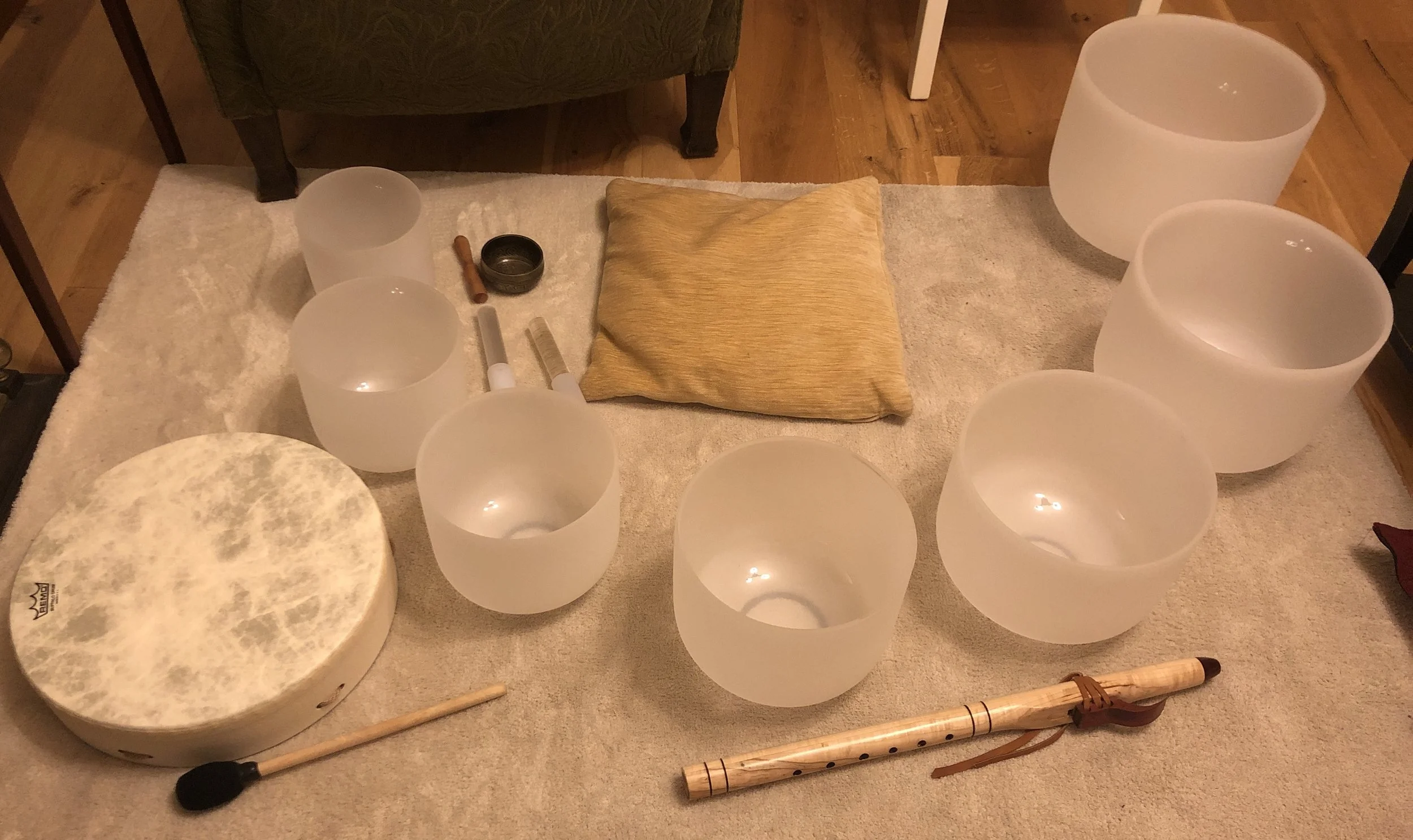 I then invite participants to get comfortable on their ground (yoga) mats, and take them through a relaxing and gentle breathwork meditation for 5-10 minutes. Now in a deep state of relaxation, I play various healing instruments including crystal sound bowls, flutes, pipes, drumming, and singing bowls.